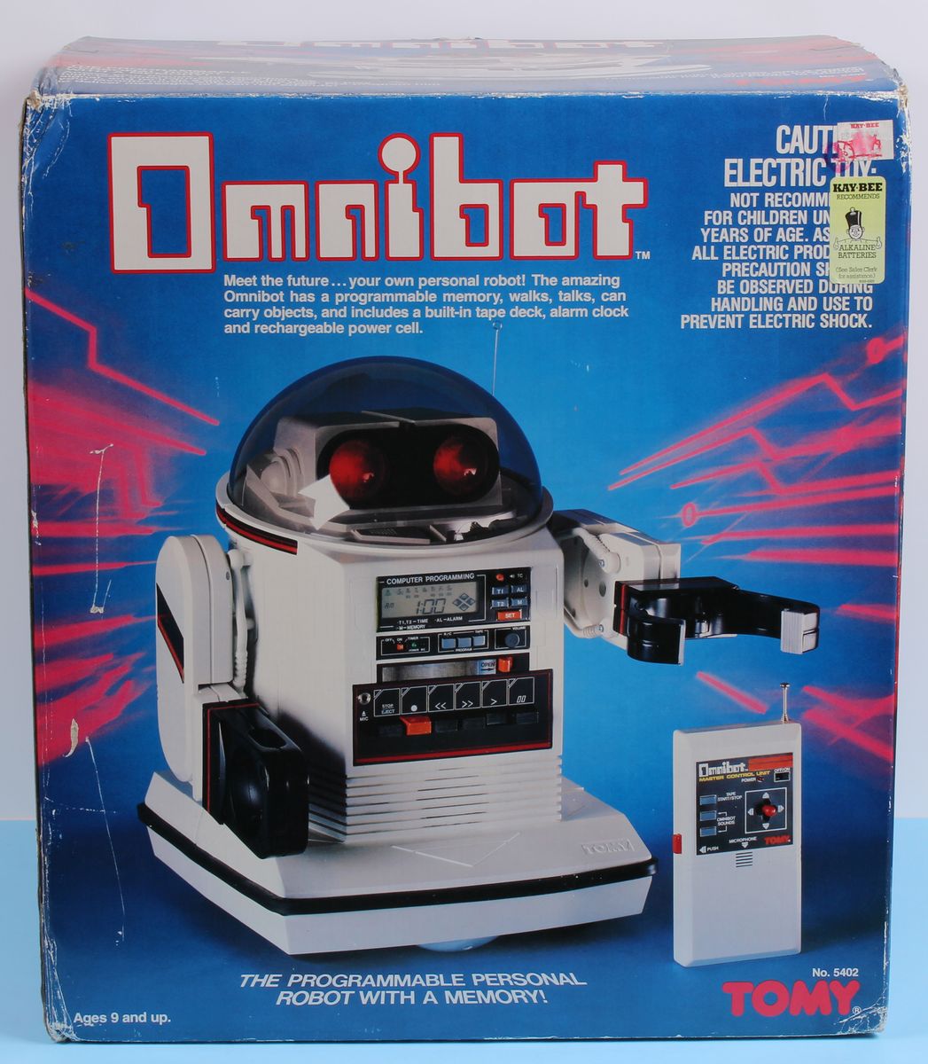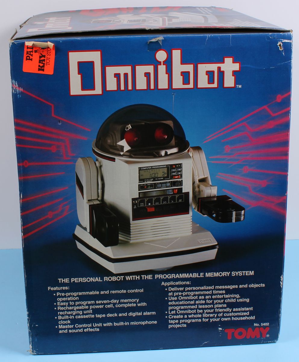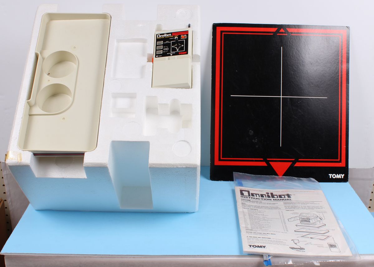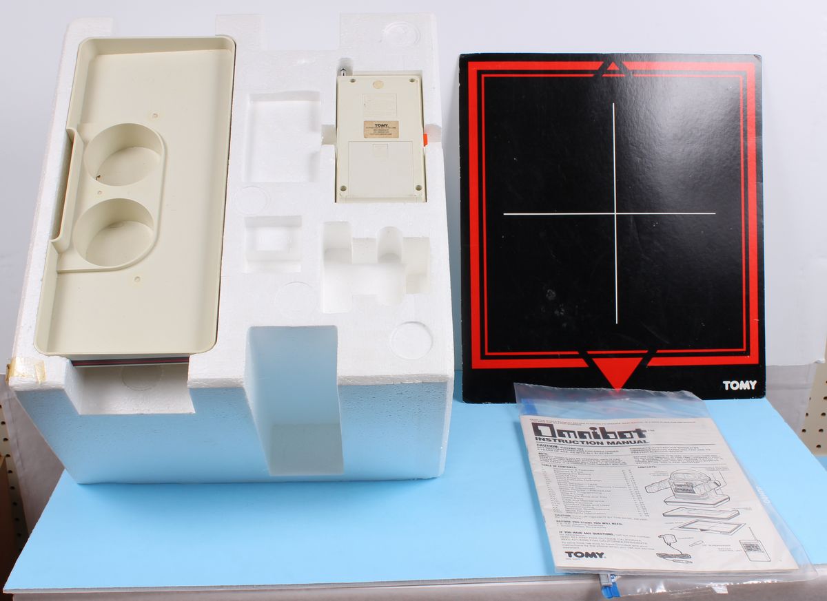 Omnibot Robots Tomy MIB C-9 Rare 1980s Toy Appears to be in Near Mint condition. Still in Shipping Case. Missing Charger. Robot’s electronics have not been tested.